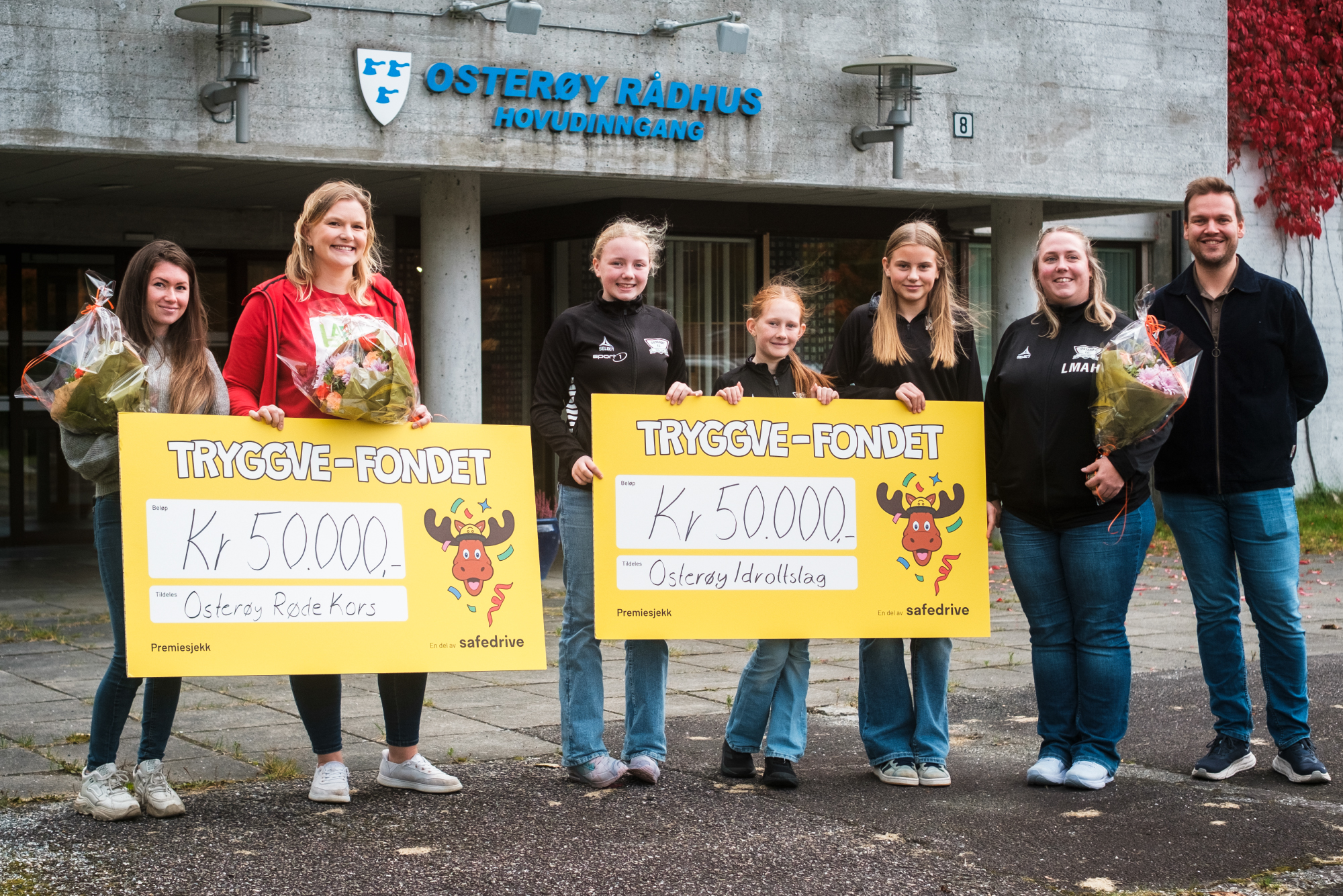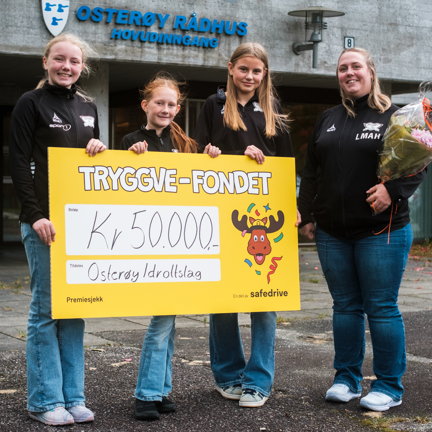 De lokale ildsjelene i Osterøy var strålende fornøyde med å få tildelt midler fra Tryggve-fondet og Safedrive. Ordfører Lars Fjeldstad (til høyre) var tydelig på hvor mye slike bidrag betyr for barn og frivillighet.
