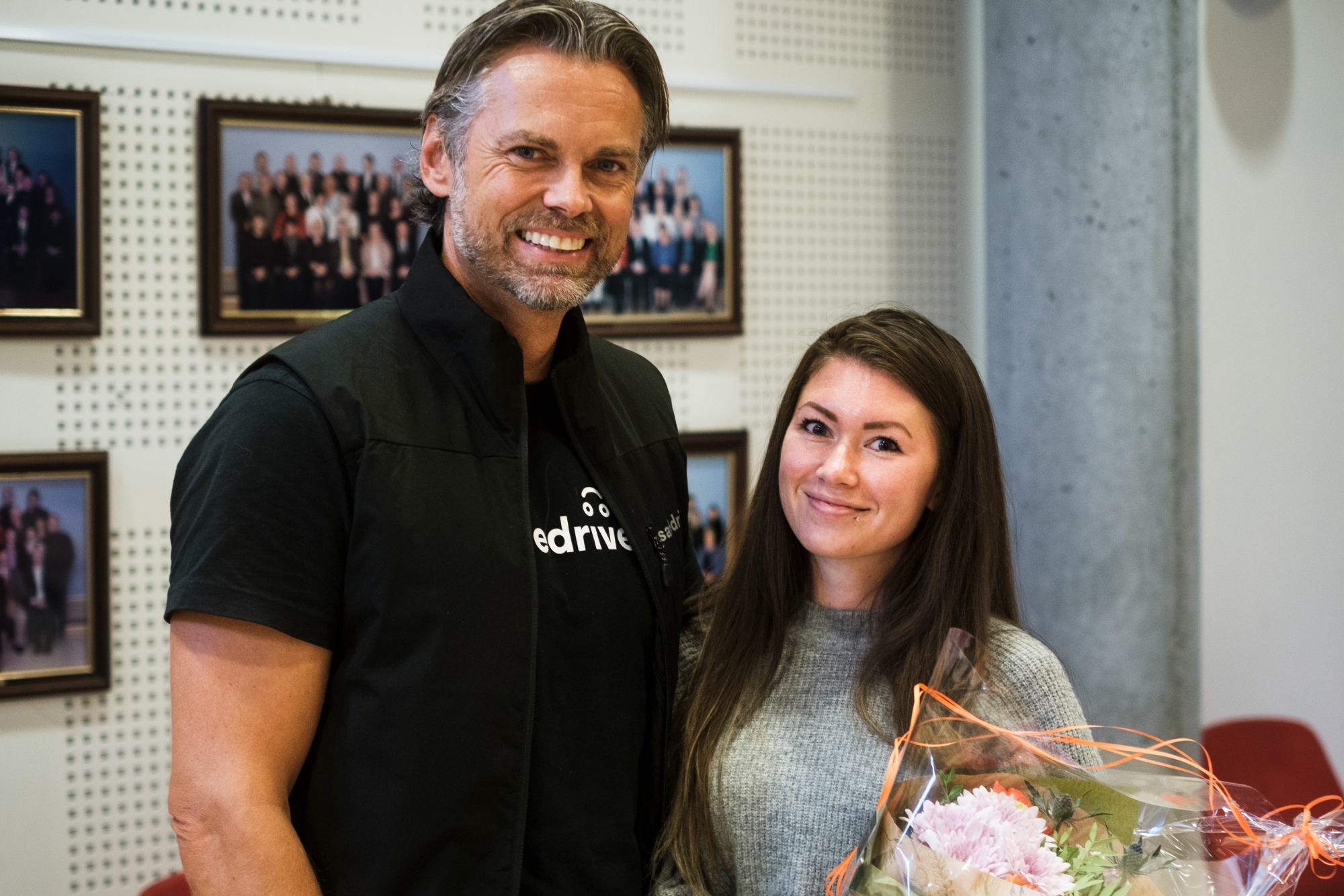 Månedens Reward-vinner for juli, Bente Katrin Halvorsen, her sammen med Knut Ove Børseth fra Safedrive. Bente valgte å gi 100 000 kroner fra Tryggve-fondet til gode formål i lokalmiljøet på Osterøy.